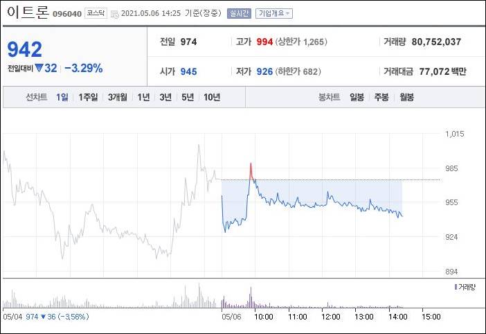 그래서 향후에도 계속 테마주 형식으로 등락폭이 클 것으로 예상되는 상황입니다. 적정주가를 딱 잡고 이야기하기가 애매한 종목이라는 것이지요. 주식투자할 때 이트론 종목은 안정적으로 길게 가지고 가는 종목이라고는 보기 어렵습니다. 투자성공을 위해서라면 적정한 선에서 치고 빠지는 걸 잘해야 할 것입니다.