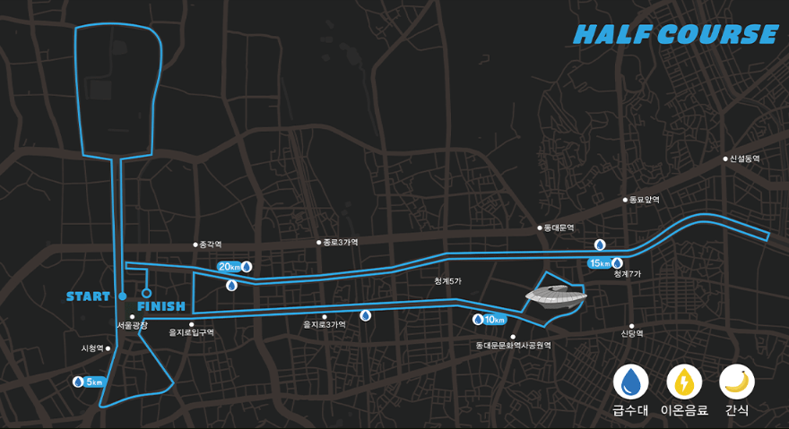 - 하프(21.1km) 코스: 서울광장에서 출발해 을지로, 동대문, 청계천, 한강대로 등 서울의 대표 명소를 경유하는 완주감 높은 루트